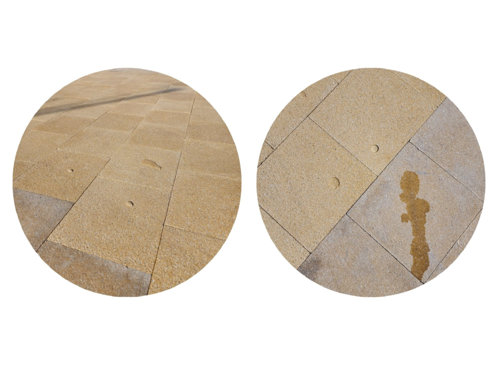 A variety of stains occur on paving stones, including stains caused by food and drink, motor oil, tyre marks, and chewing gum.